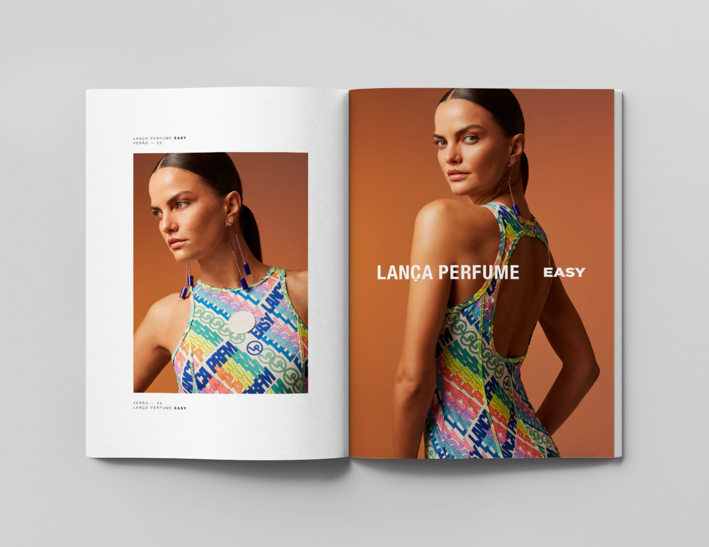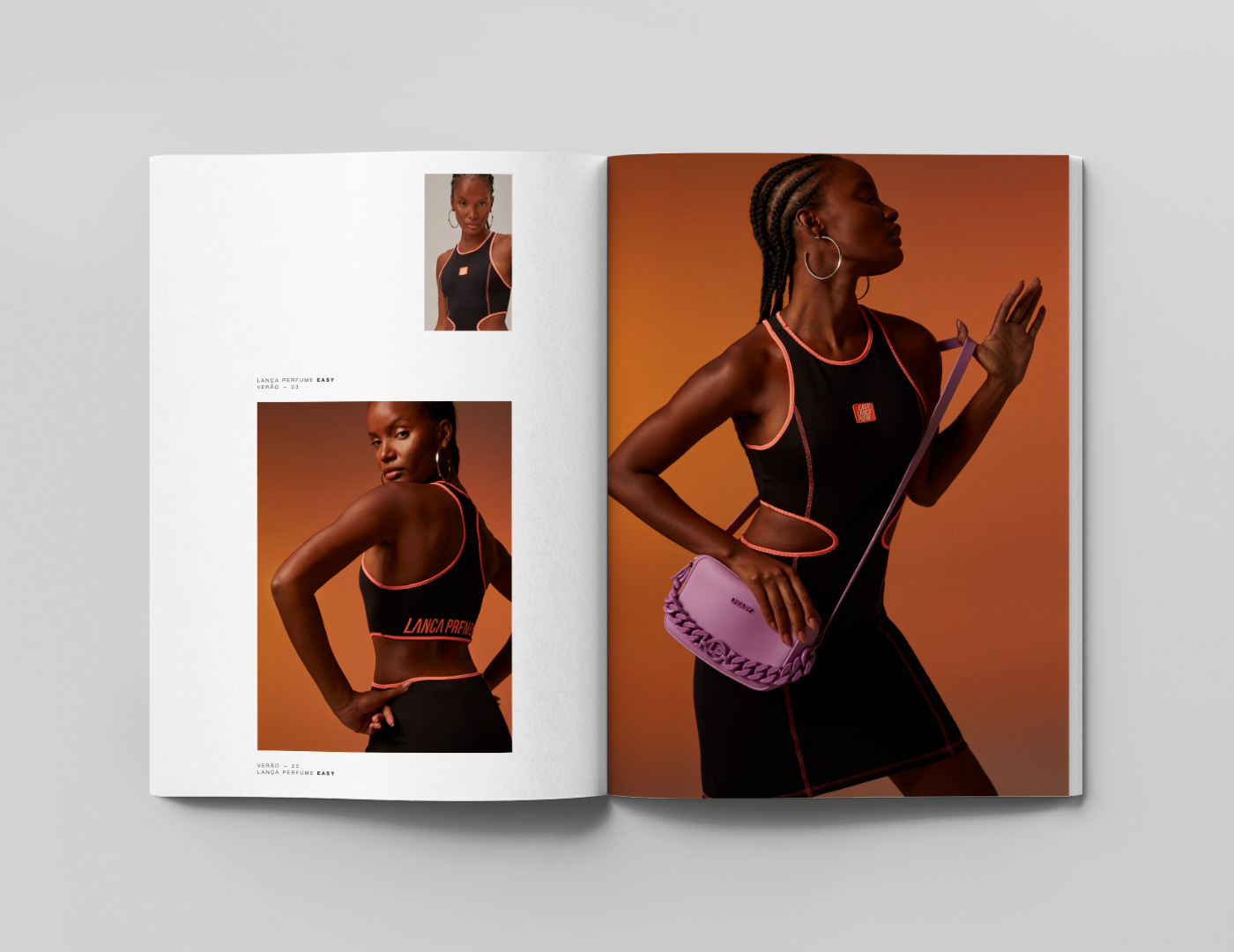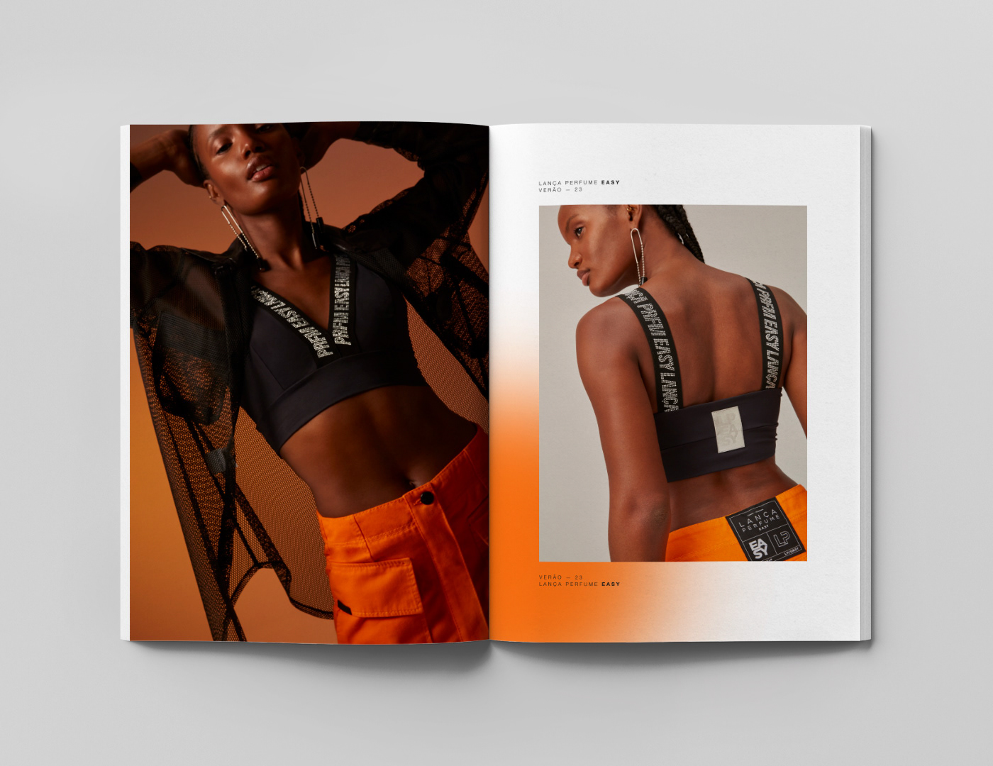 Layout of the lookbook for the Summer 23 collection by the brand Lança Perfume Easy, which emerged from a sporty and comfy line by the brand Lança Perfume. The layout of the material has elements in orange, which is present in the photos and matches summer. In addition to breathing spaces to balance the mosaic layout and more dynamic compositions. Art direction of photos by Wagner Alves, Graphic Design by Suemi Sakamoto.